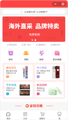 组件:搜索框、轮播图、导航图标、图片魔方、标签栏、专题、视频、公告、领券中心、商品分类......